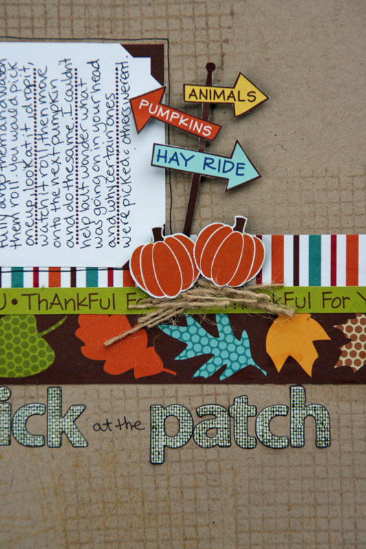 I used part of the packaging from the Jillibean Soup corrugated shapes for my title area. I used a bunch of twine from my stash, and the dark brown burlap included with the kit.