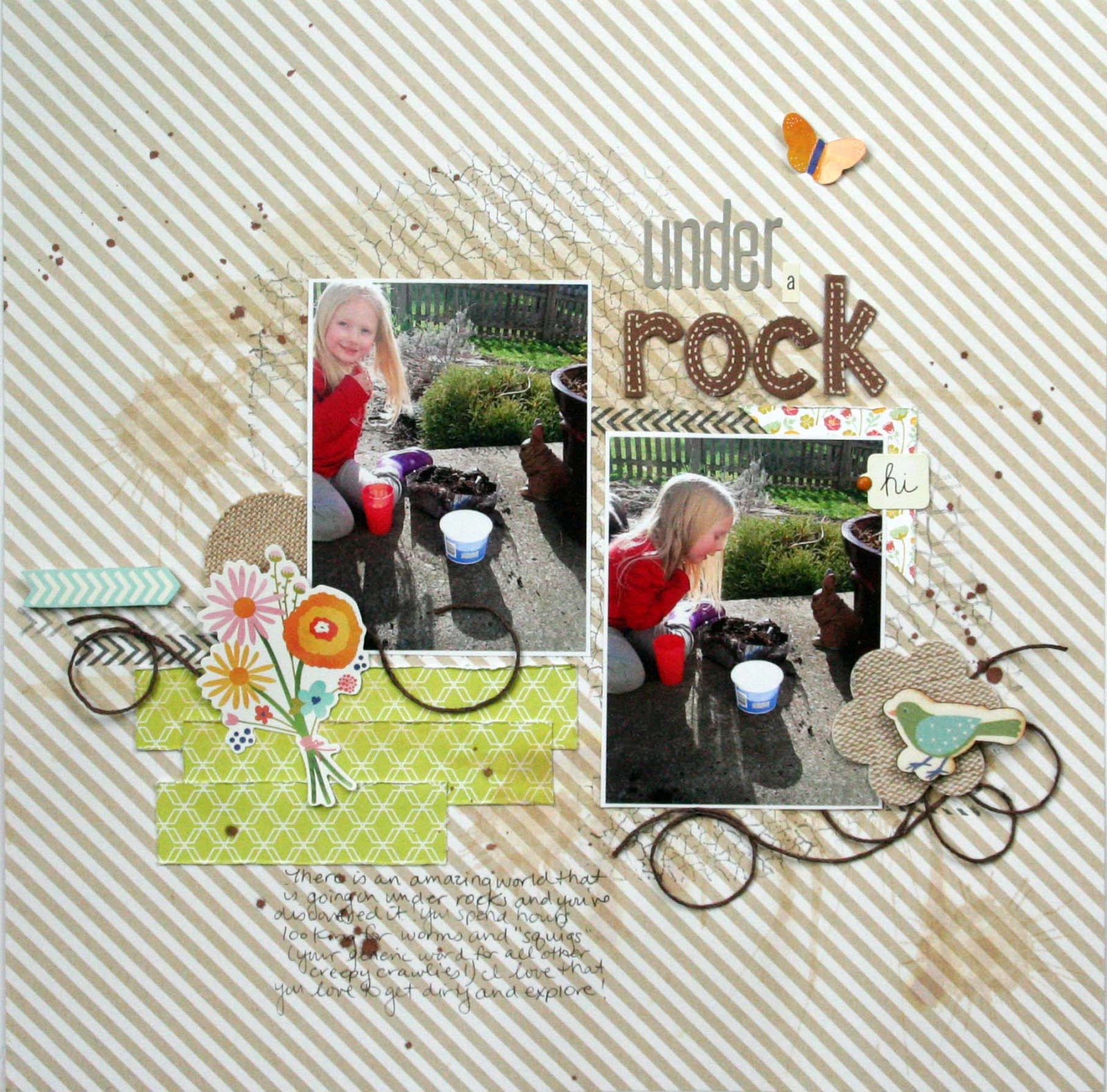 I had to use something brown and squiggly to remind me of worms, and this twine from Lawn Fawn was perfect! The other embellies are from Pebbles Lakeside collection and LYB Naturals collection (which was given to me by a sweet lady by the name of Lisa Swift! :) ).