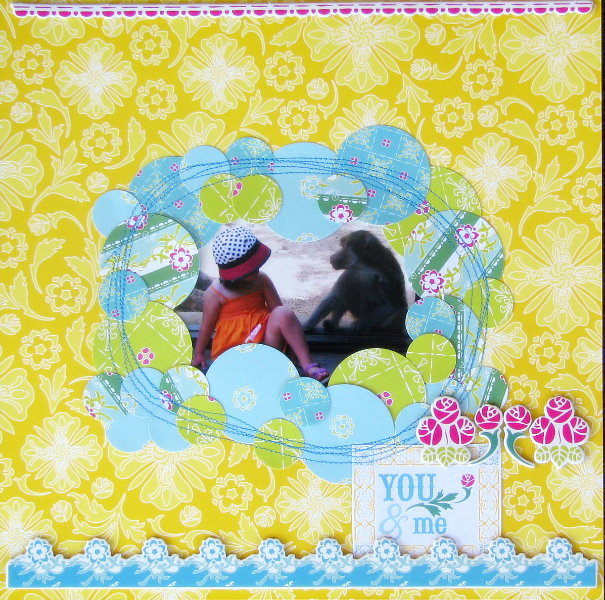I happened to be at my mom’s house while I was doing this LO, so I was able to use her sewing machine for this page. It is very subtle, but I sewed some large sunrays on the background with some yellow thread.