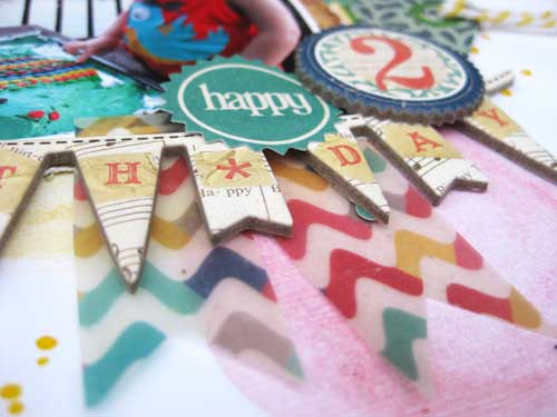 After spending what seemed like forever putting the pages in the right order, I took some more papers from my stash and did simple photo mats for each photo and added some other strips of papers here and there. Then each photo got finished with some washi tape, and I completed the page with enamel dots, brads, sentiment stickers, and a few chipboard pieces here and there.
